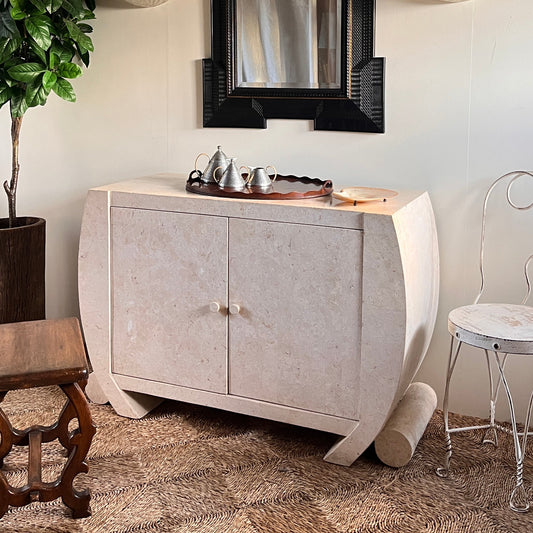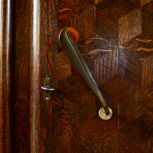 Pair of Art Deco Belgian Parquetry Cabinets with Rose Marble Tops.