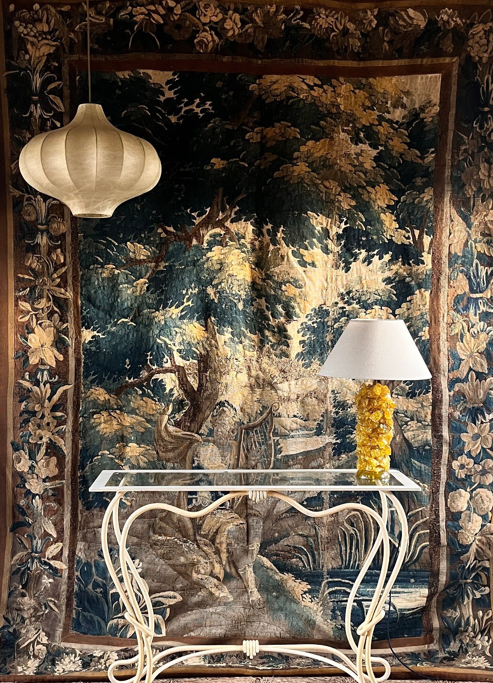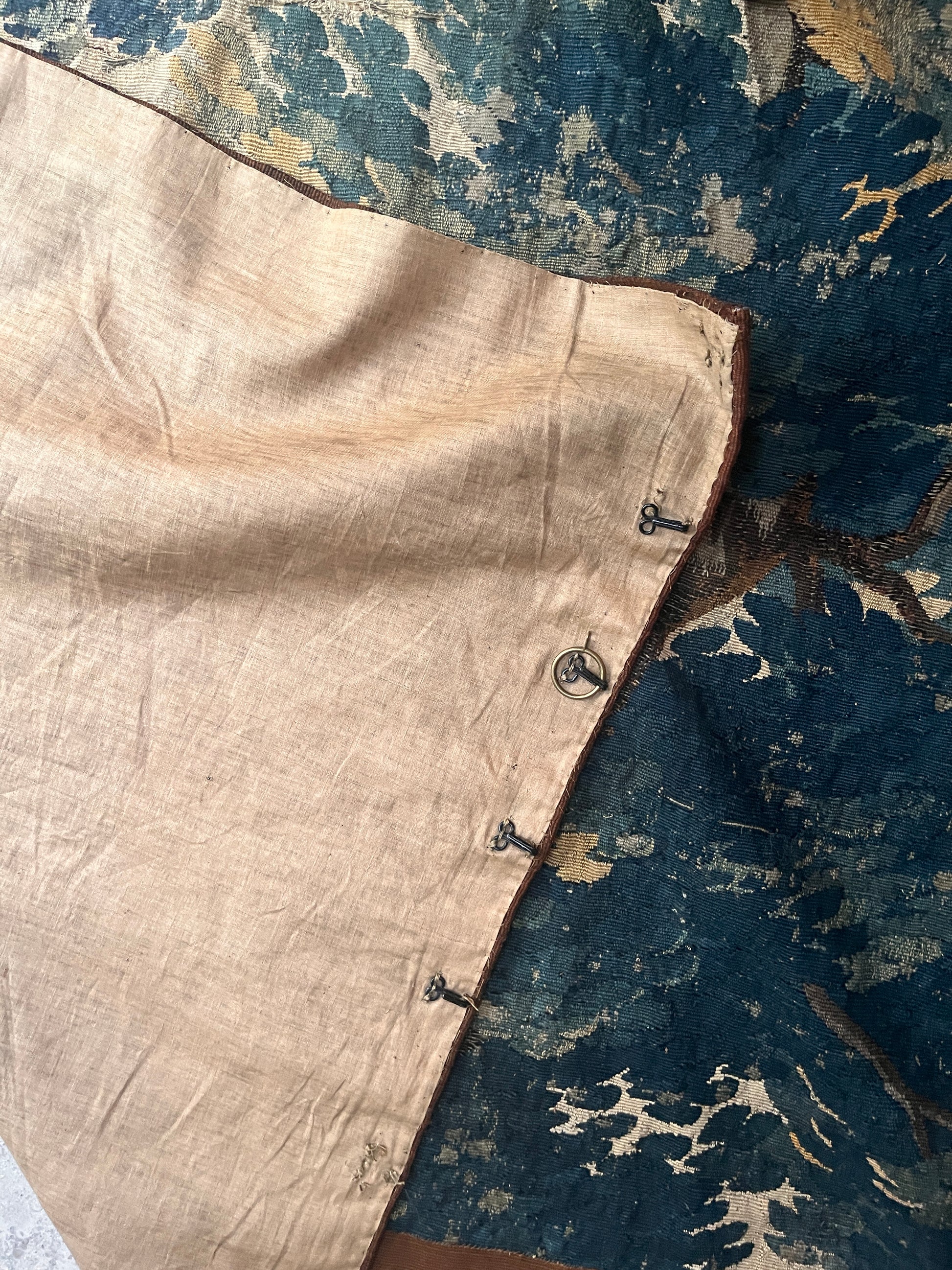 A characterful original Flemish verdure tapestry dating from around 1780–1830, in the much sought after blues and greens. It depicts a tranquil woodland landscape with rich foliage, soft golden light, and a classical seated figure beside a stream. Woven in the traditional Belgian manner, it retains its original floral border and the deep, natural tones typical of late-18th-century vegetable dyes.