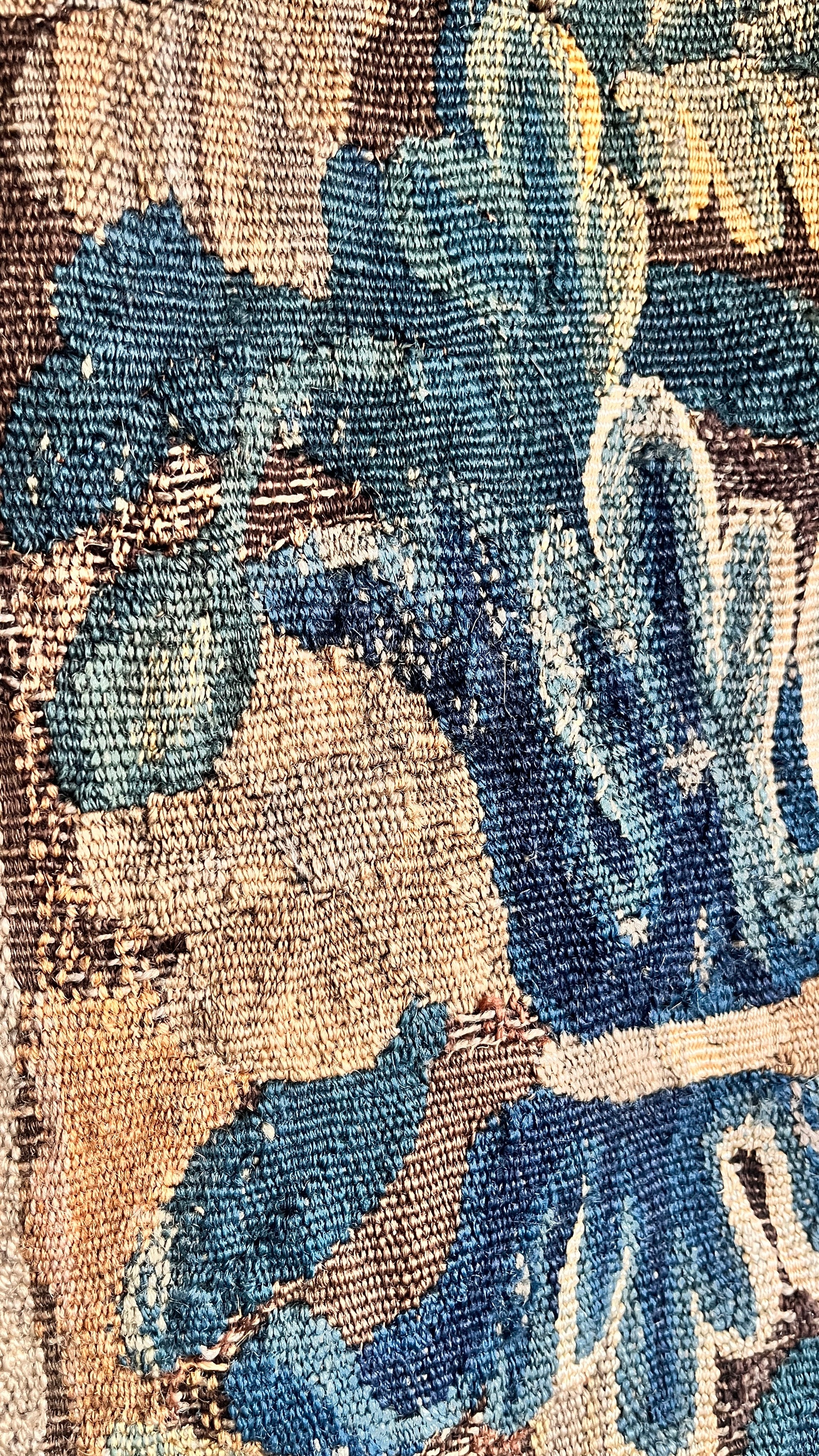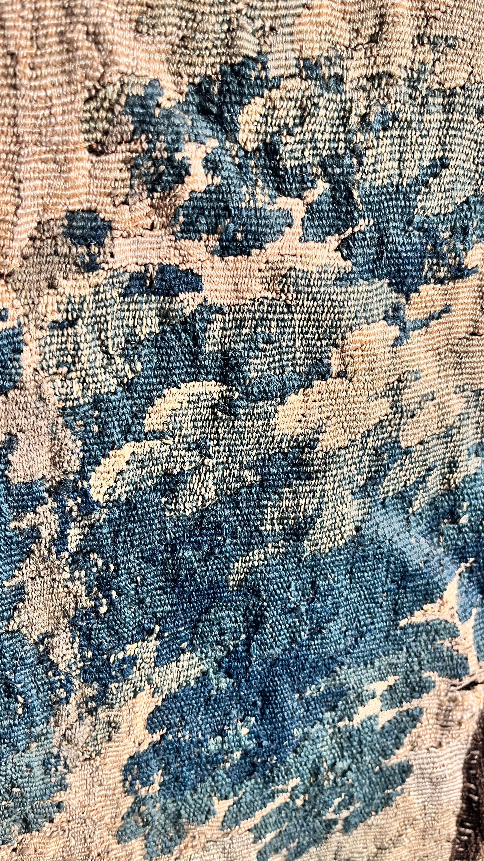 This tapestry shows scattered areas of wear and tear and rudimentary historical mends but remains an impressive piece and retains much of its rich palette.