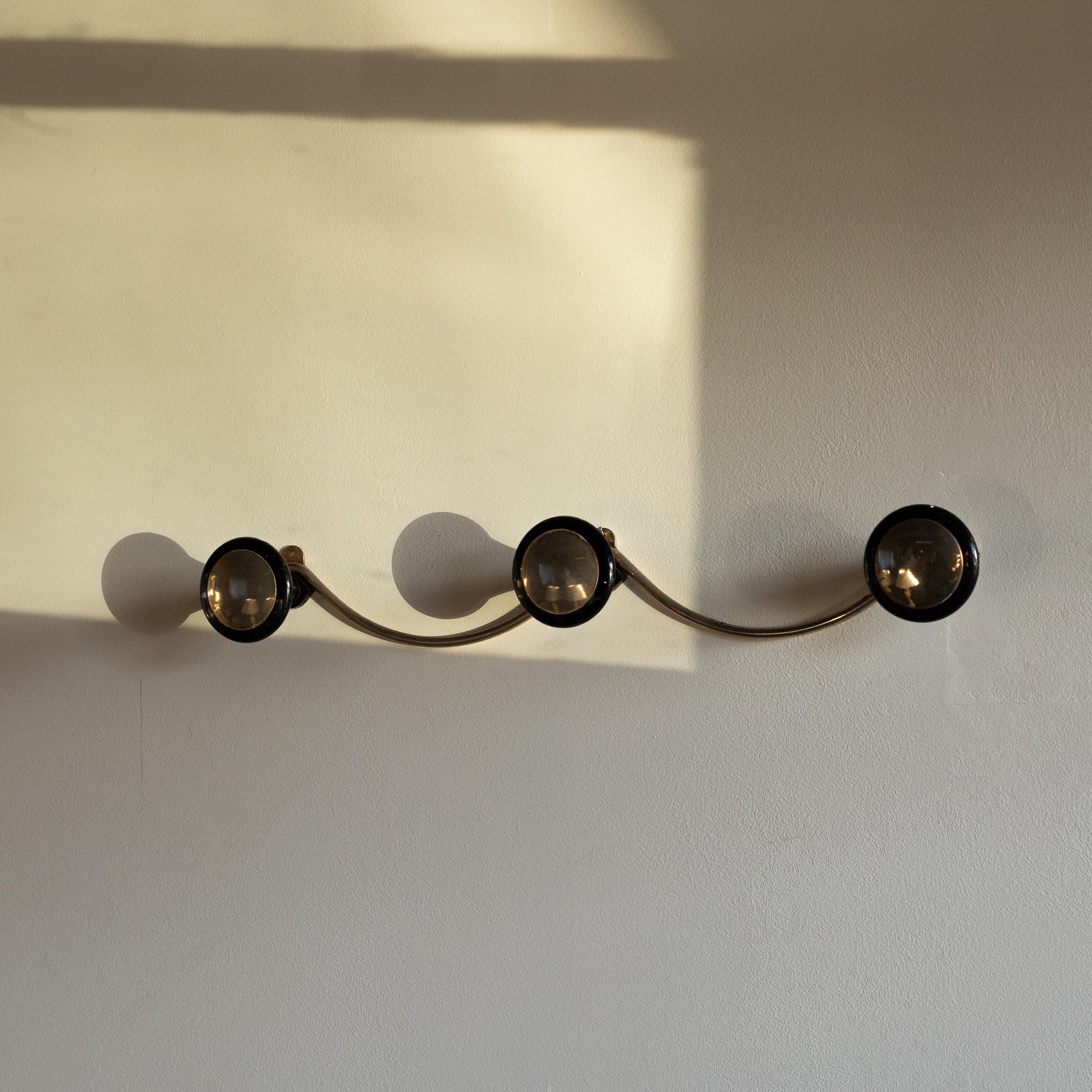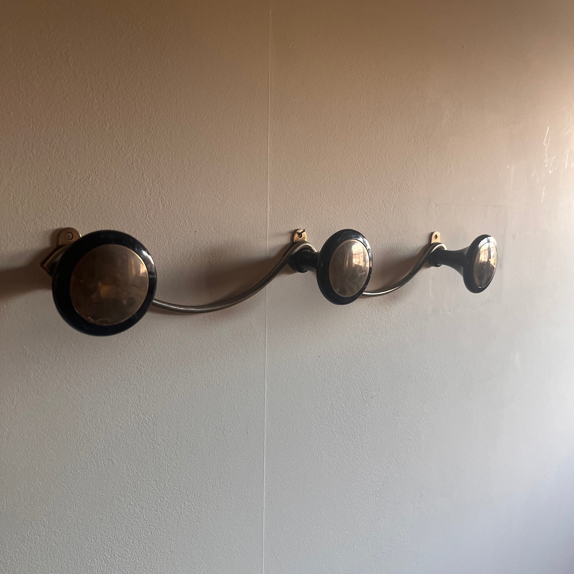 Smart midcentury chrome coat rack with three black lacquered metal hooks