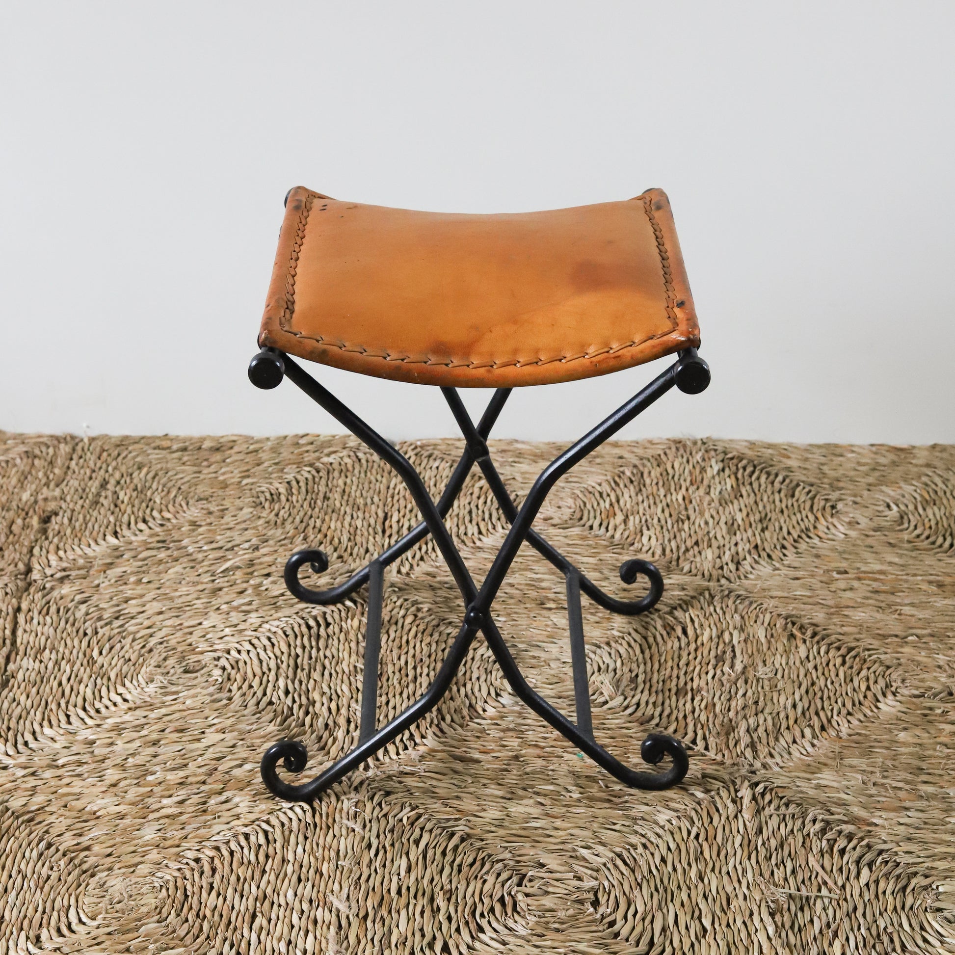 Midcentury French Iron stool with leather seat. A lovely little accent piece which can by folded away when not in use.