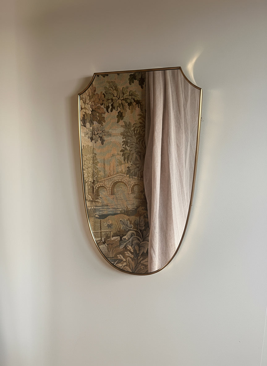 Large original mid-century Italian brass shield mirror in the manner or Gio Ponti. Excellent quality and remains in good condition with more recent replacement mirror glass.