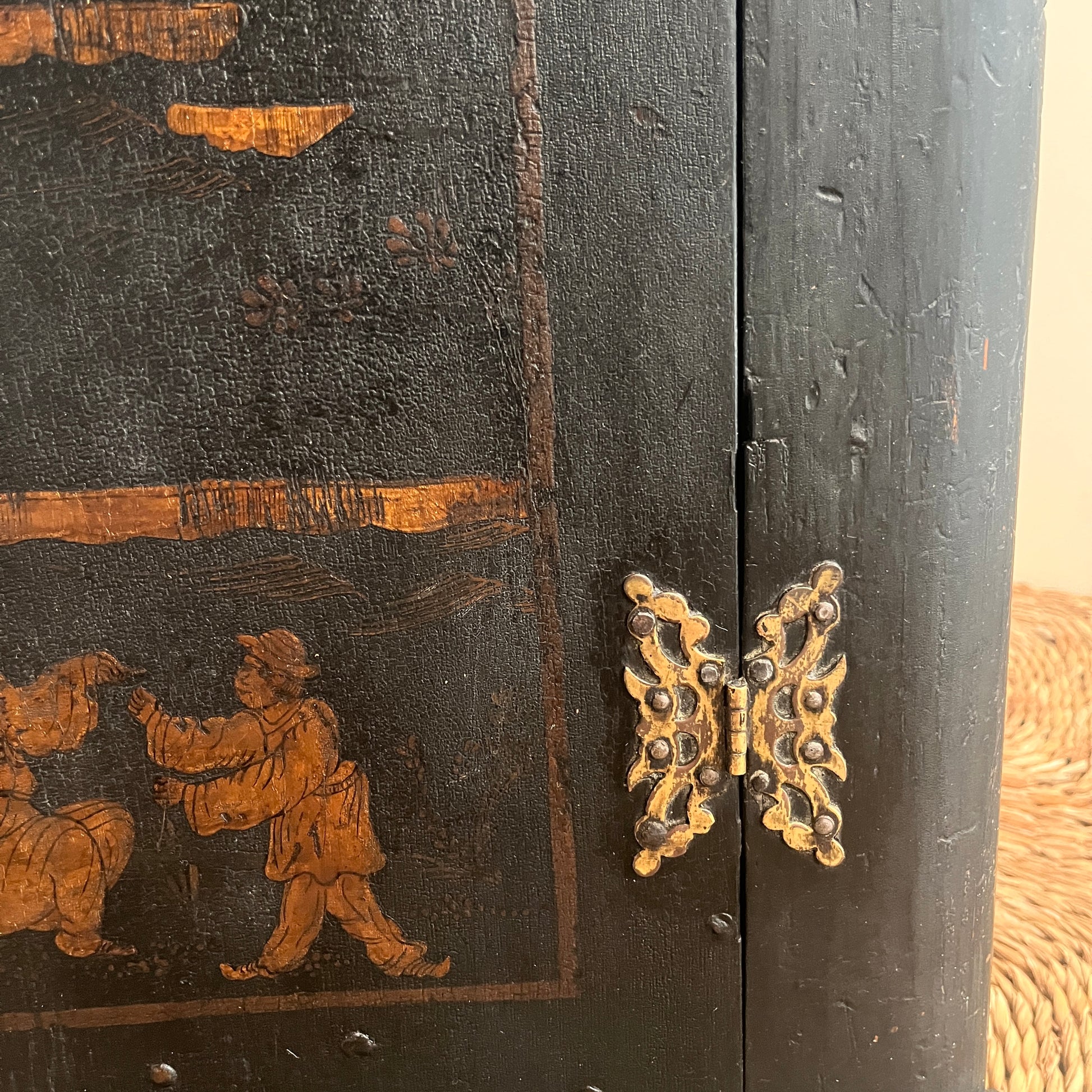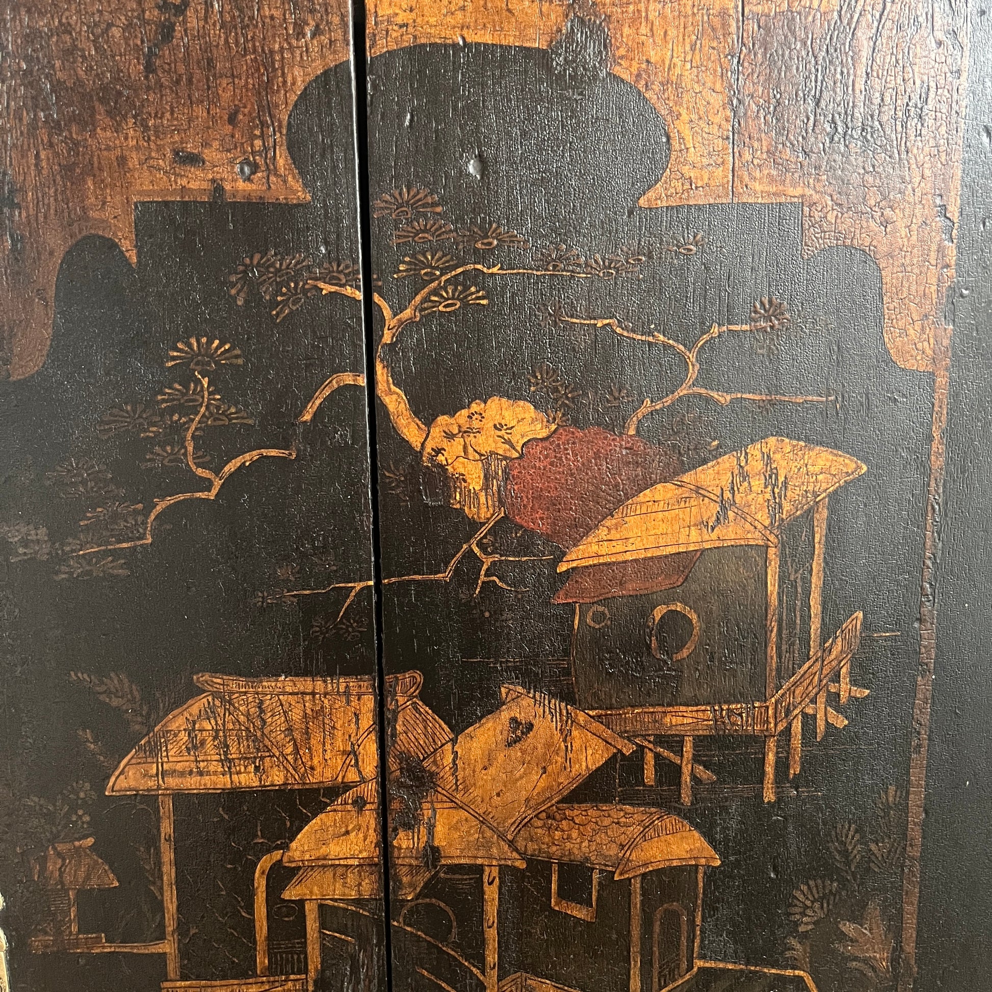 Late Georgian chinoiserie hanging corner cabinet is with hand-painted lacquer panels portraying scenes of pagodas, trees, and figures. Preserved in its original unrestored state, it displays wear consistent with its age with signs of old paint at the back and side from its previous homes. Some signs of old woodworm at the back (treated)