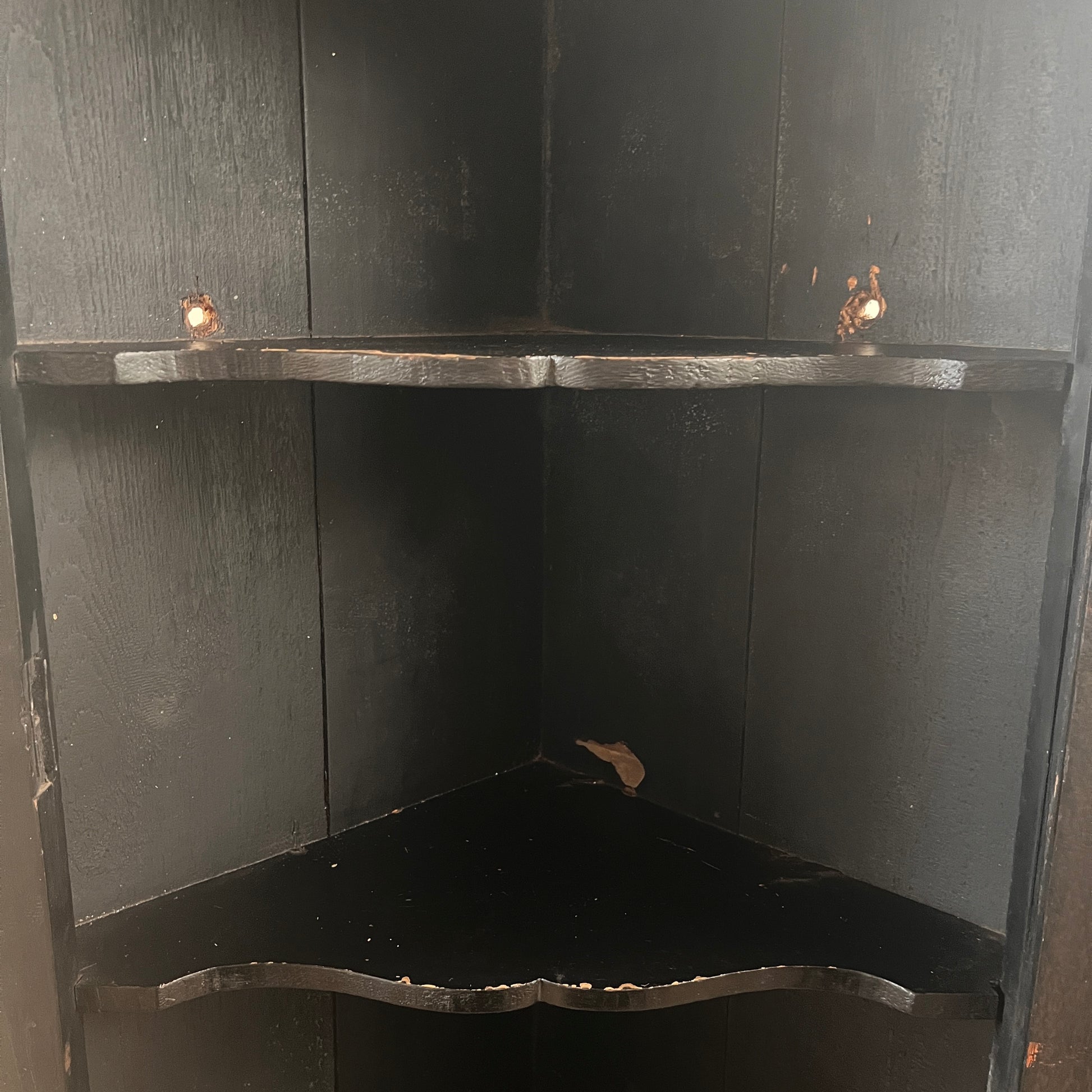 The piece is complete with internal shelves, its original key, gilt brass butterfly hinges, and an ornate escutcheon. Two pre-drilled holes in the back panels allow for hanging, with the option to install additional hardware if preferred.
