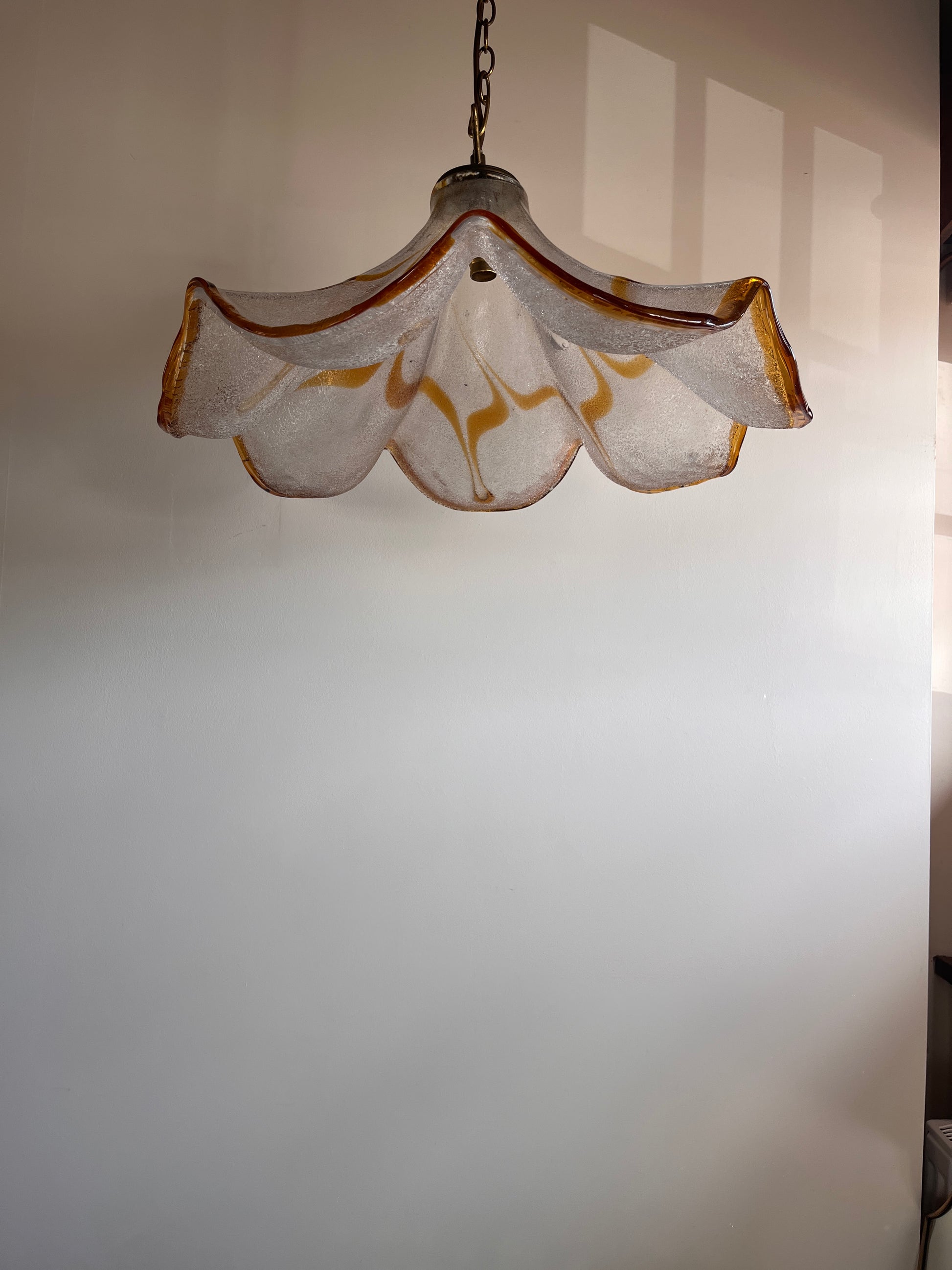 Beautiful Murano glass hanging light C.1970. This large example features a striking wavy silhouette with warm amber tones. The textured 'graniglia' glass diffuses the light beautifully.