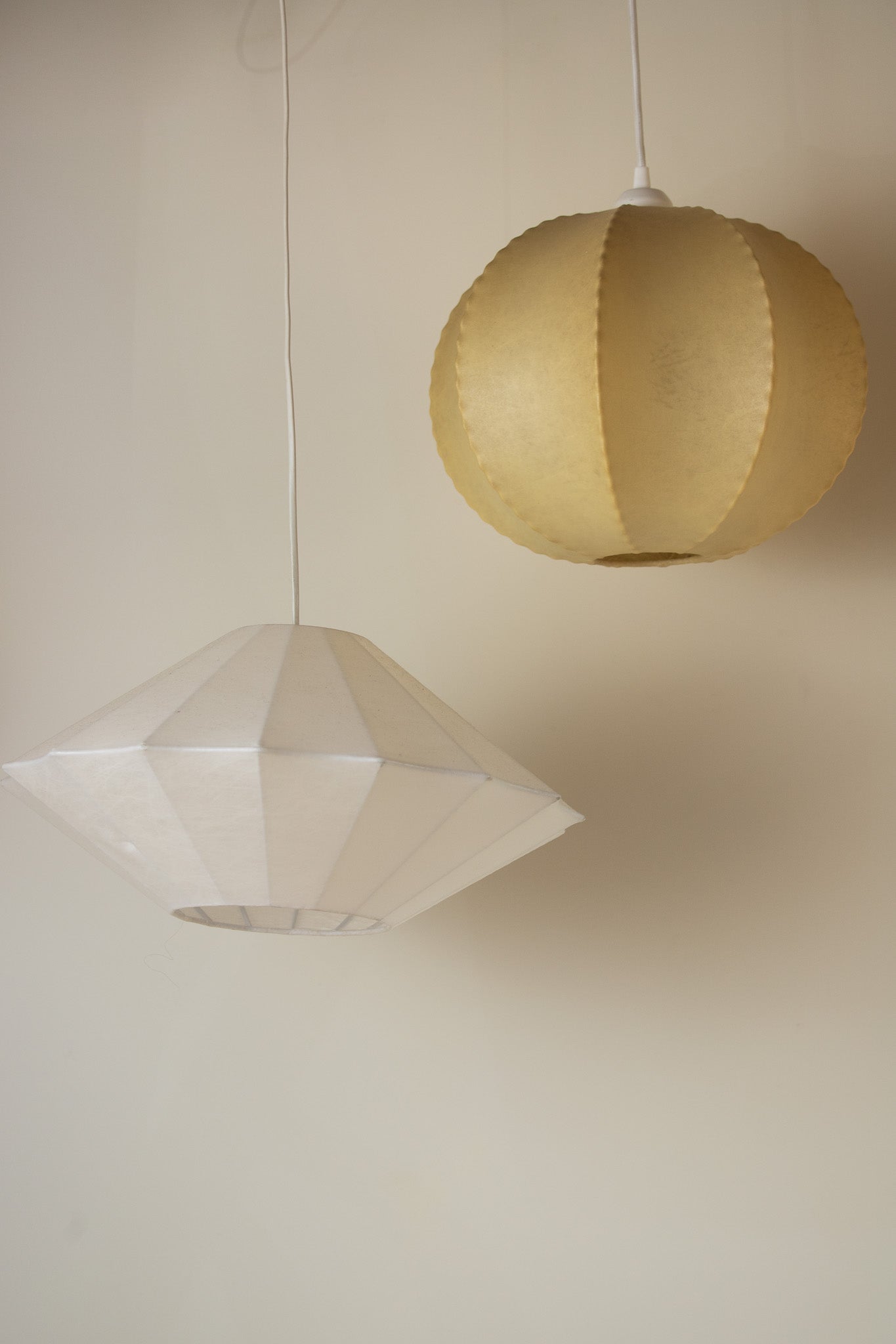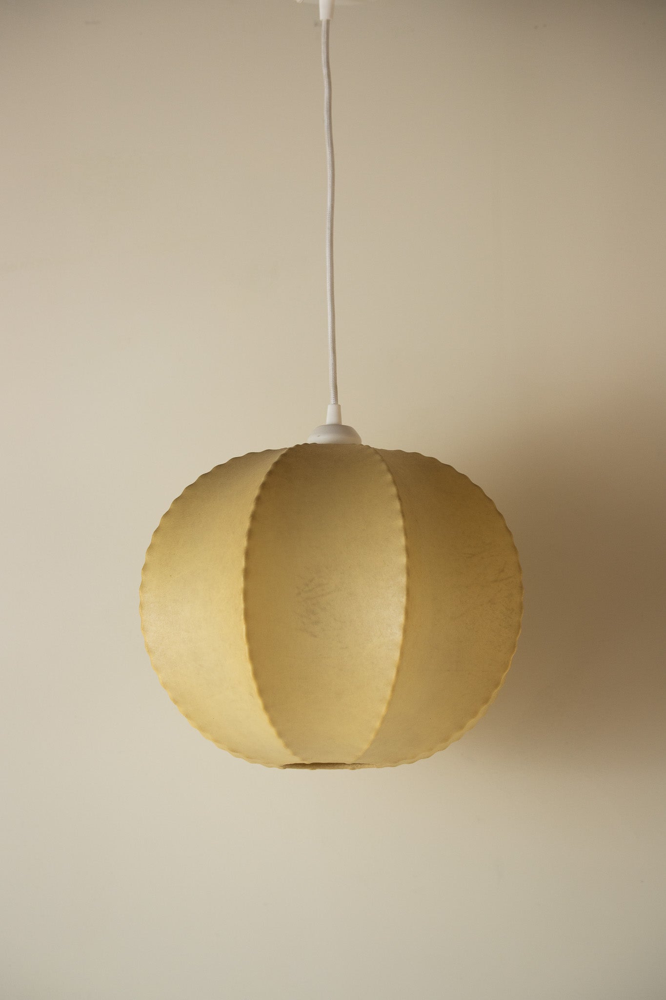 Mid-century pendant ‘Cocoon’ pendant . Its soft, diffused glow and sculptural silhouette reflect the material innovation of the era. Attributed to Achille & Pier Giacomo Castiglioni for FLOS