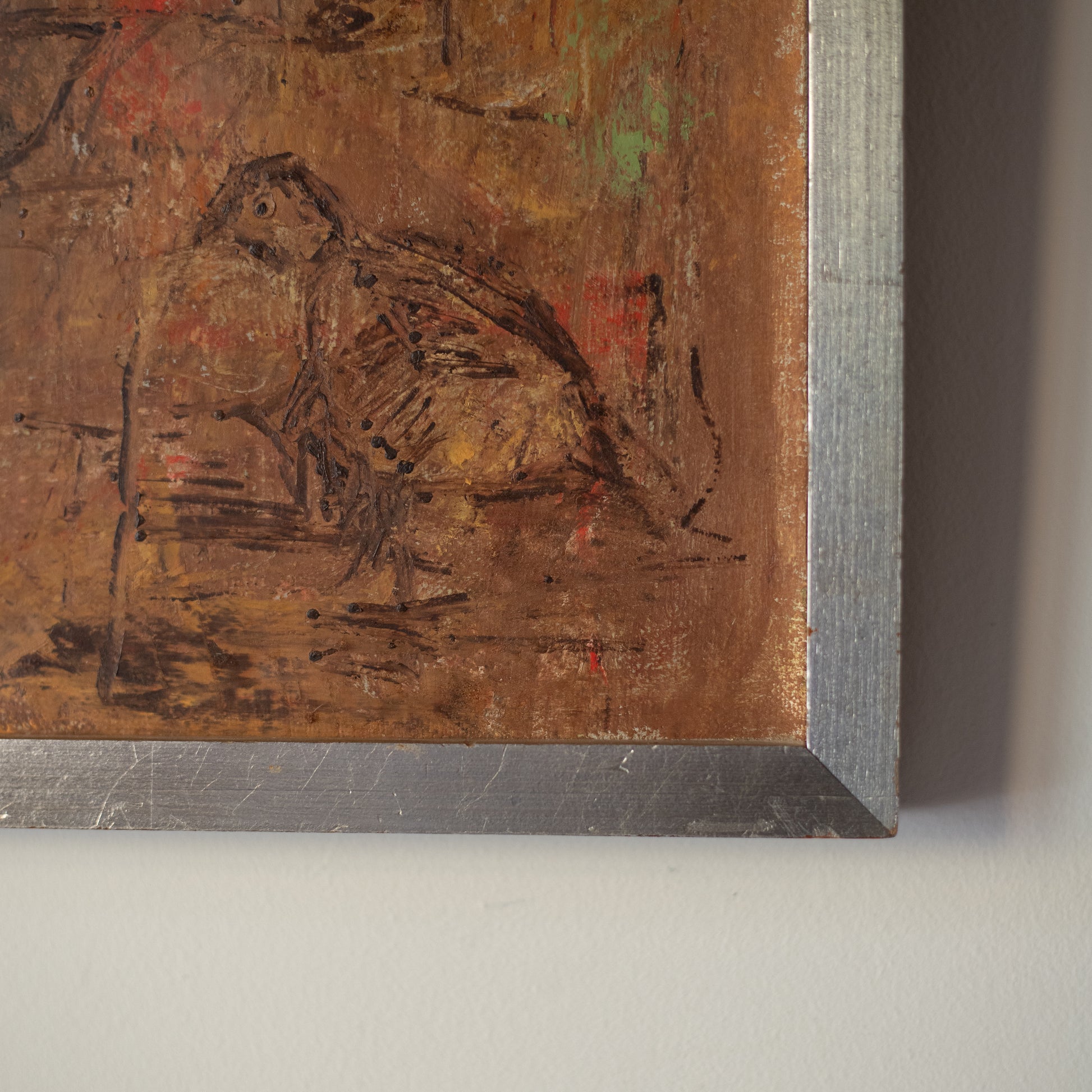 An abstract oil on canvas titled "Bird's Nest" by Swedish artist Andreas Lensdorf (b. 1921). Created in the 1950s–60s the piece reflects the mid-century Scandinavian interest in organic motifs and gestural mark-making. Mounted in the original painted wood frame.