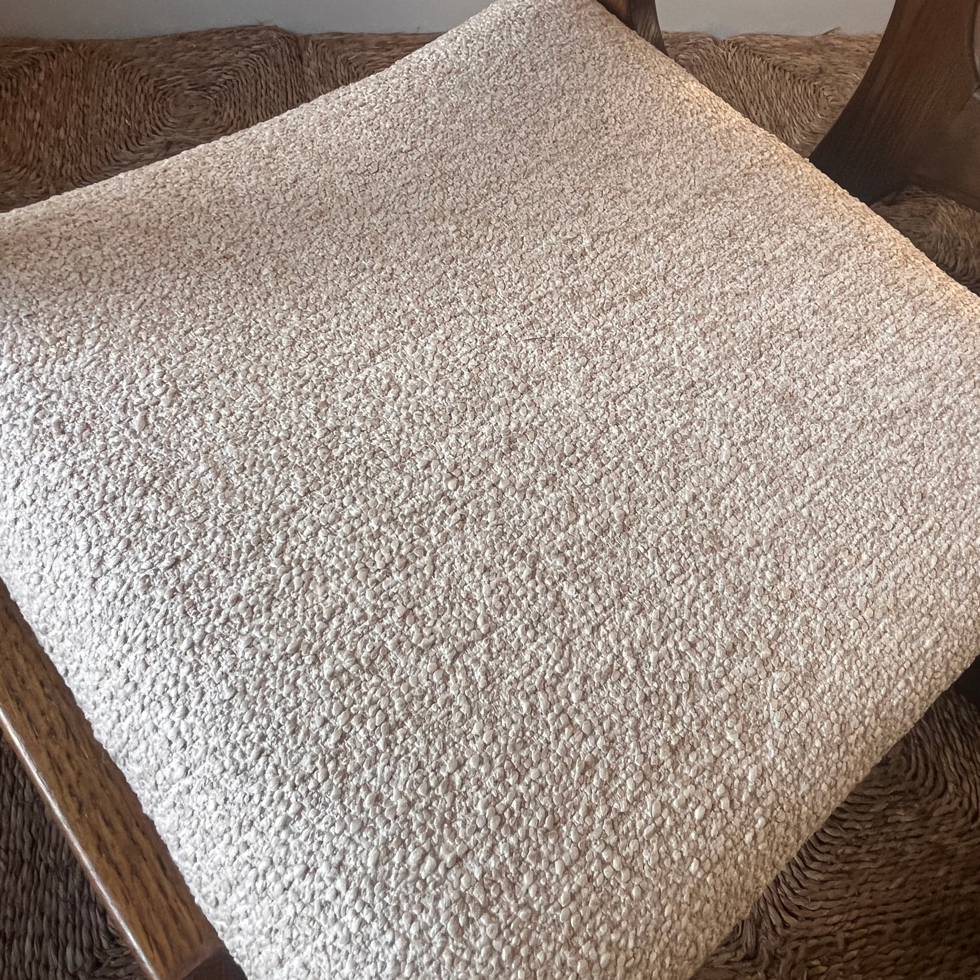 These chairs have been professionally reupholstered, in a soft, stain-resistant, easy clean, boucle fabric in ‘Natural’. The reupholstery includes new padding and fully compliant FR (Fire Retardant) labels.