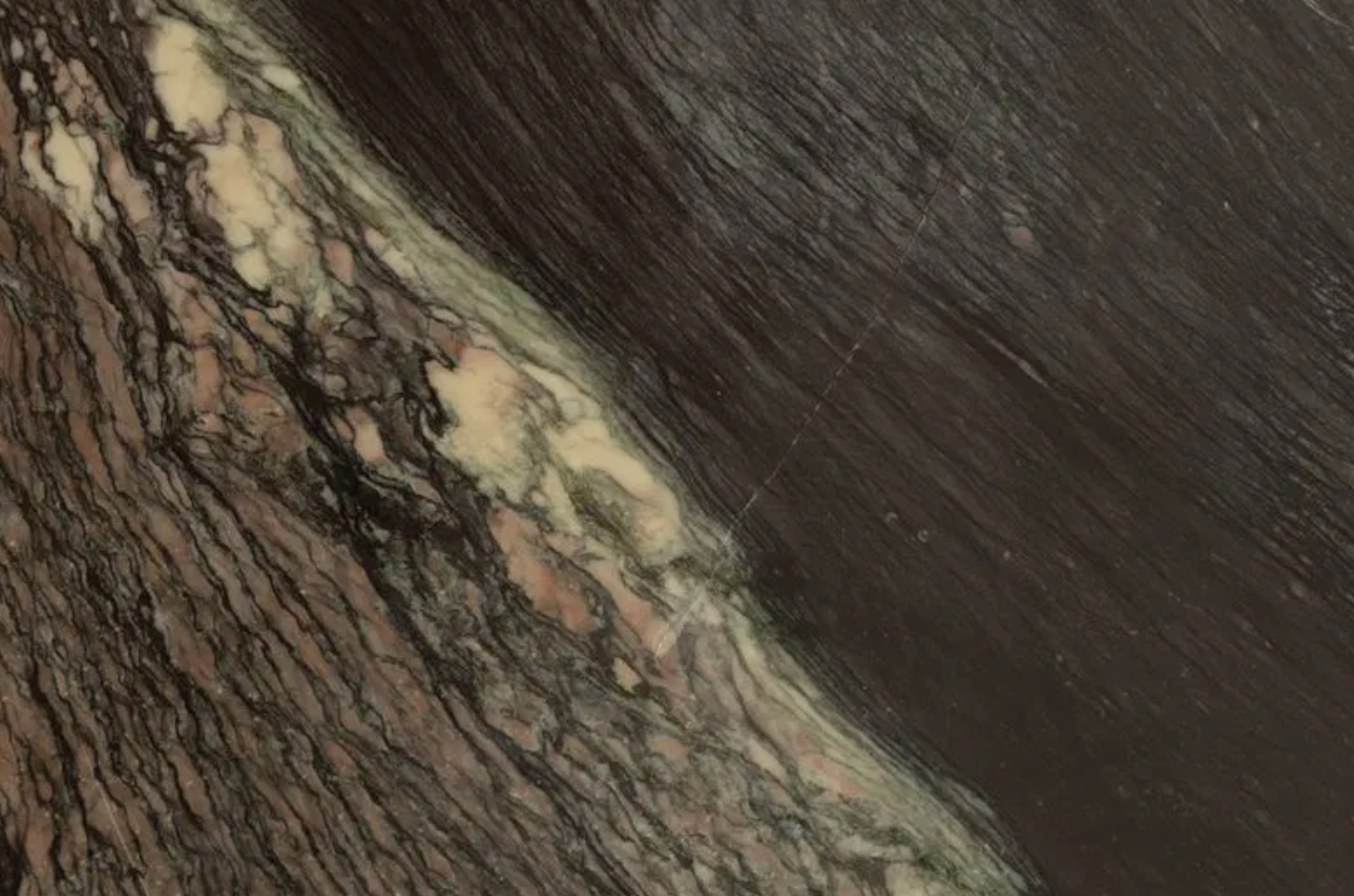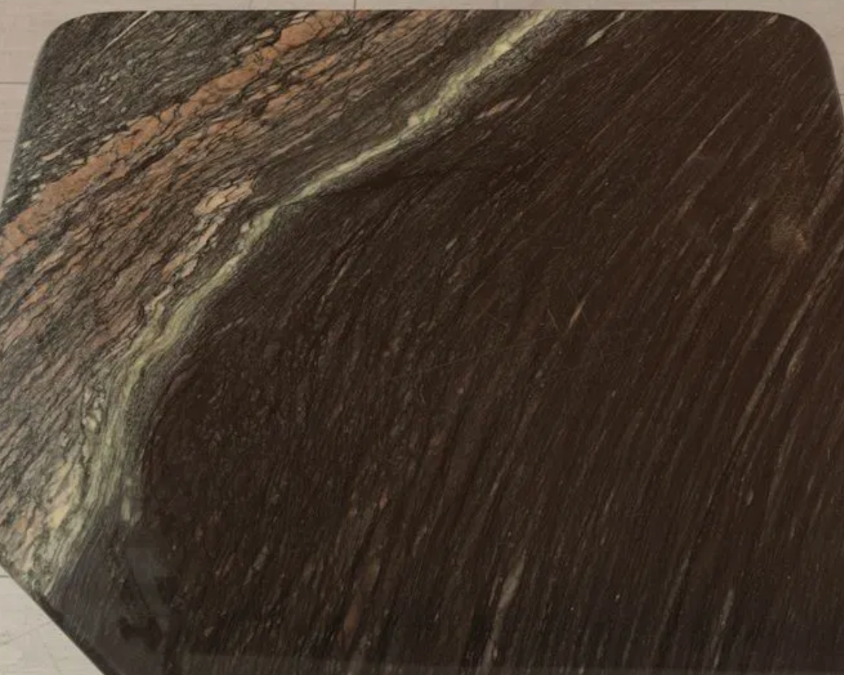 A set of 3 Italian marble tables c.1970, each formed from solid, variegated stone with angular tops and block pedestals. The surfaces show green, brown, cream and charcoal veining. The set can allowing be grouped as a stepped coffee table or separated for side-table use.