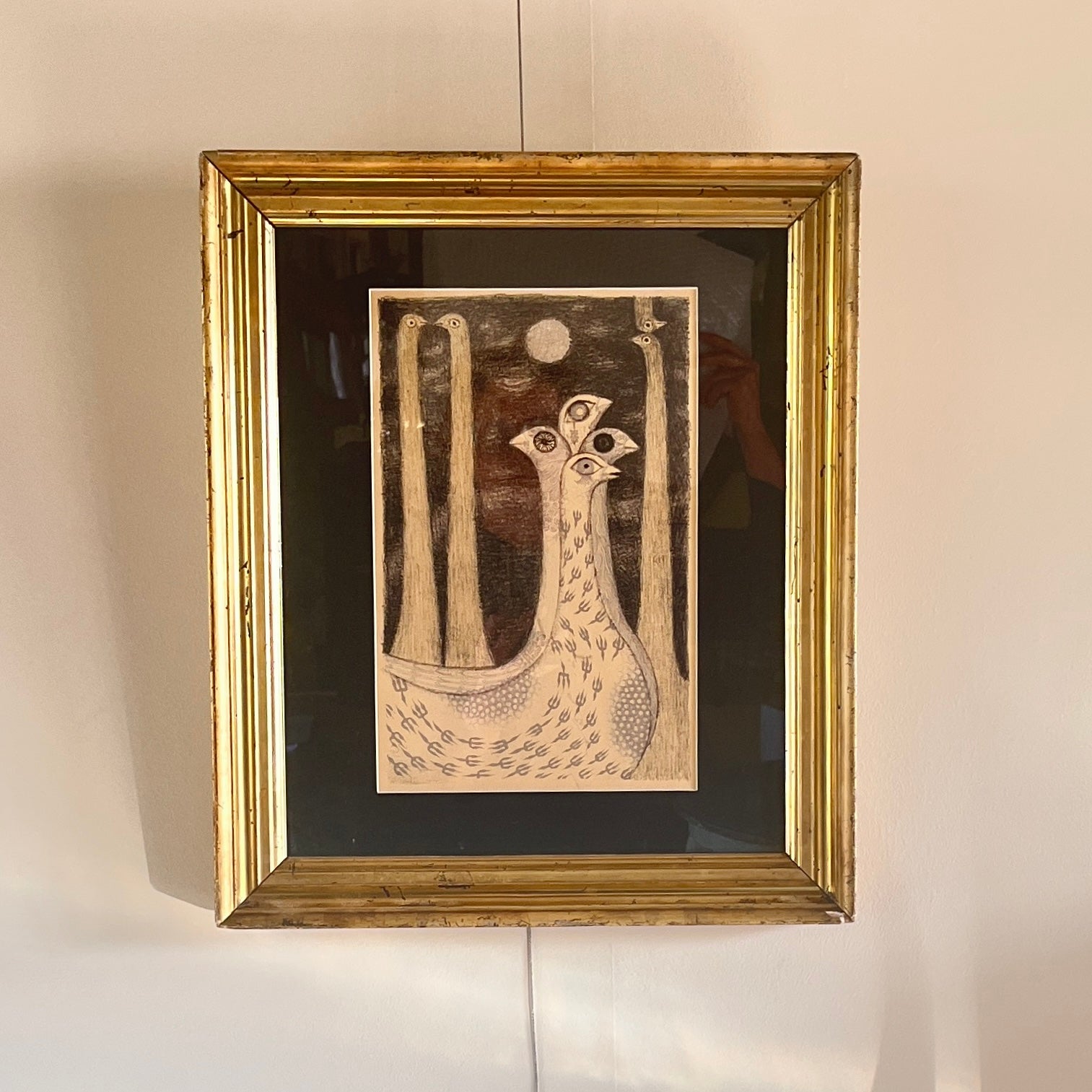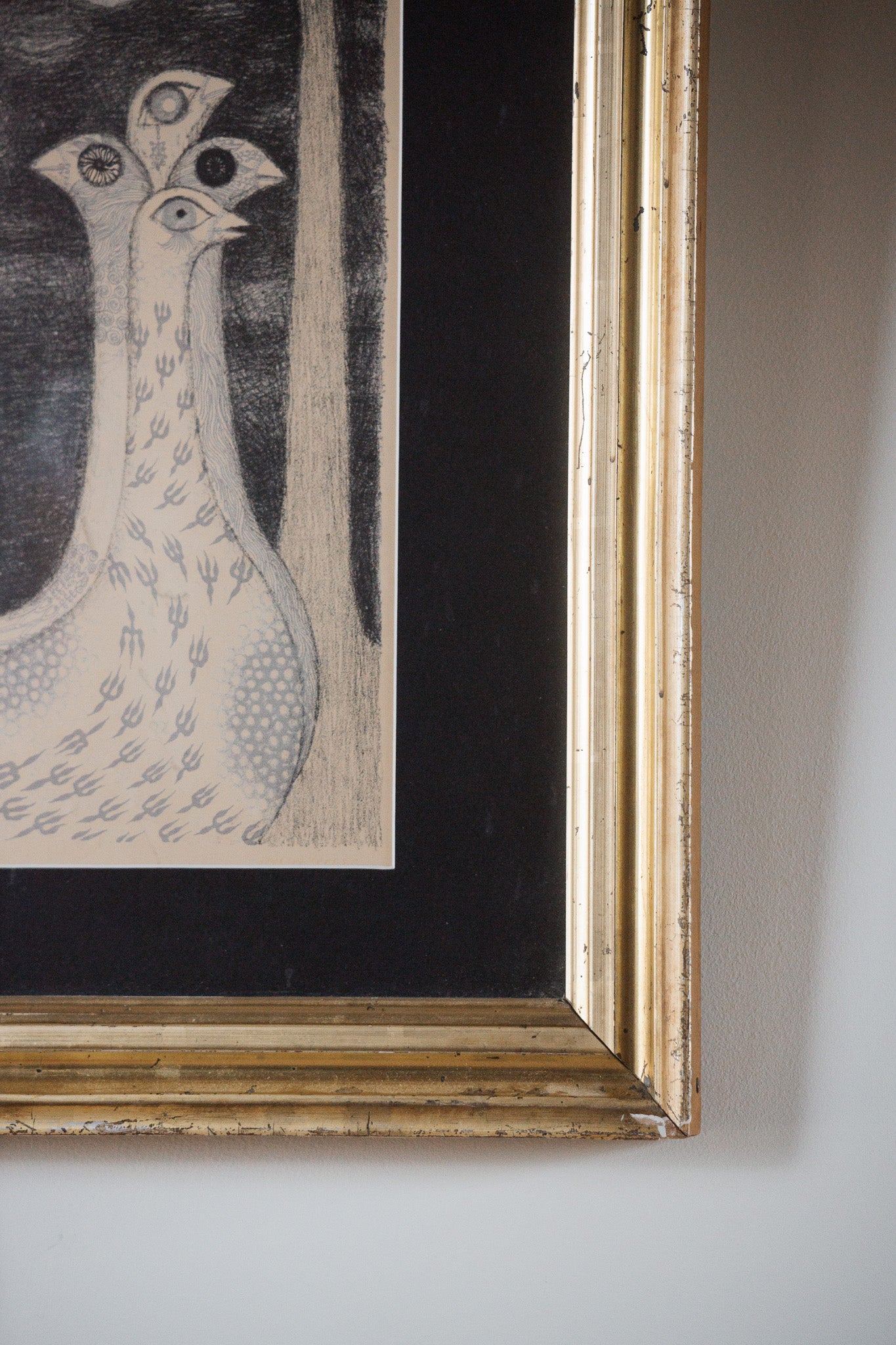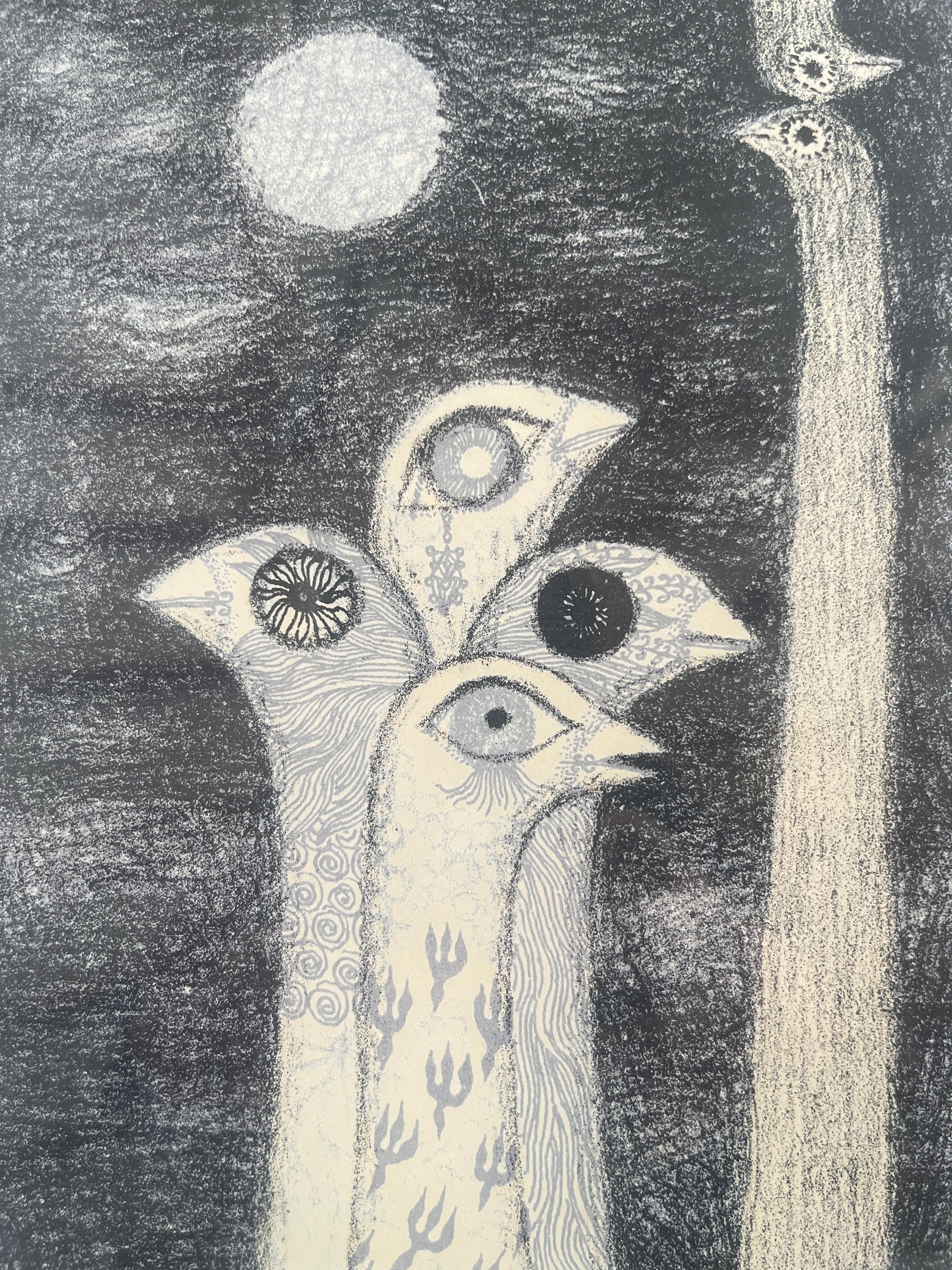 A striking surrealist lithograph by renowned Swedish artist Max Walter Svanberg. This composition features a trio of long-necked birds under a glowing moon.